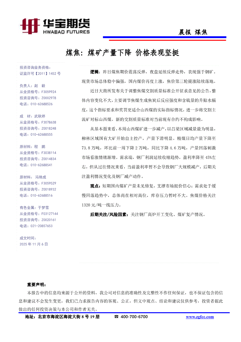 华宝期货-煤焦晨报:煤矿产量下降,价格表现坚挺-251106