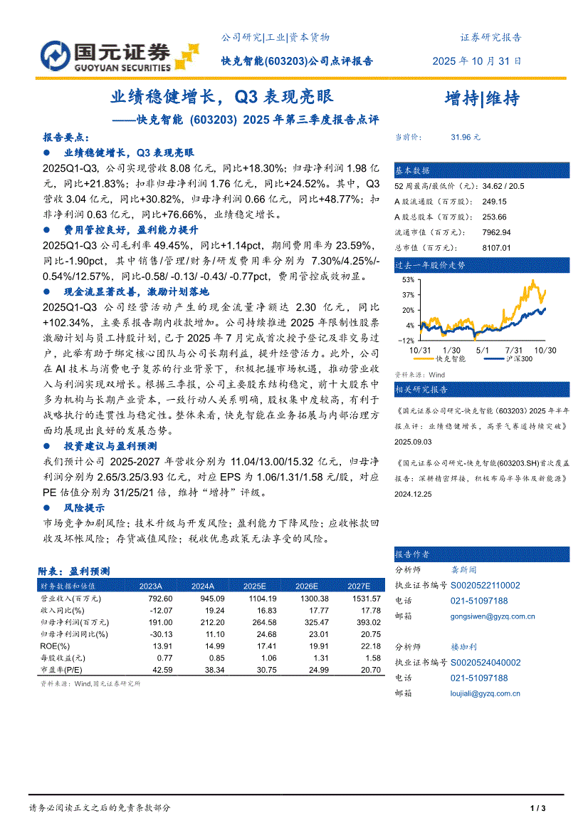 快克智能:国元证券-快克智能-603203-2025年三季报点评:业绩稳健增长,Q3表现亮眼-251031