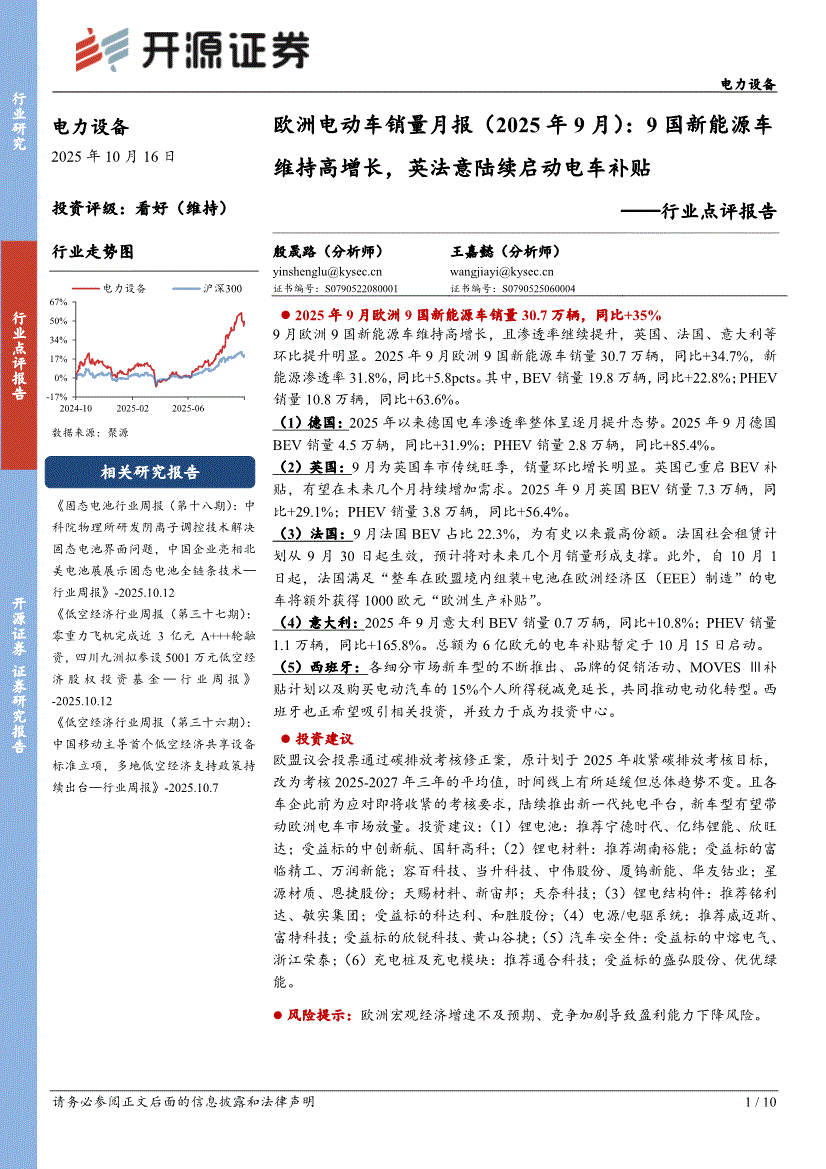 电力设备行业:开源证券-电力设备行业点评报告:欧洲电动车销量月报(2025年9月),9国新能源车维持高增长,英法意陆续启动电车补贴-251016