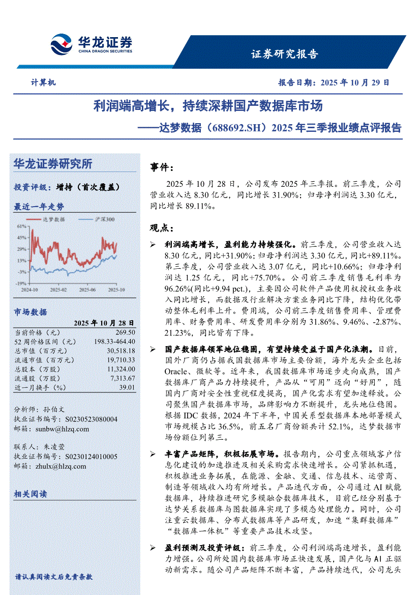达梦数据:华龙证券-达梦数据-688692-2025年三季报业绩点评报告:利润端高增长,持续深耕国产数据库市场-251029