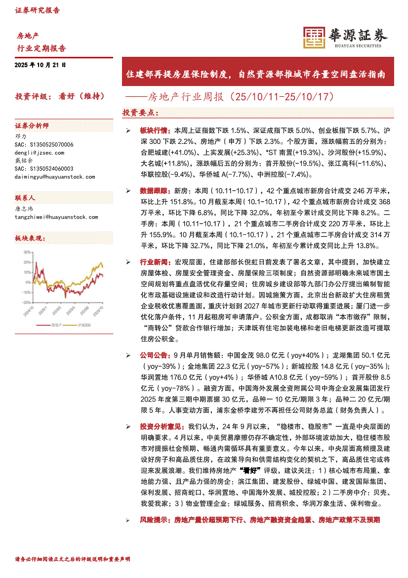 房地产行业:华源证券-房地产行业周报:住建部再提房屋保险制度,自然资源部推城市存量空间盘活指南-251021