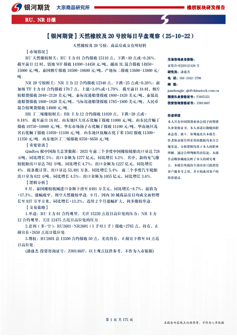 银河期货-天然橡胶及20号胶每日早盘观察-251022