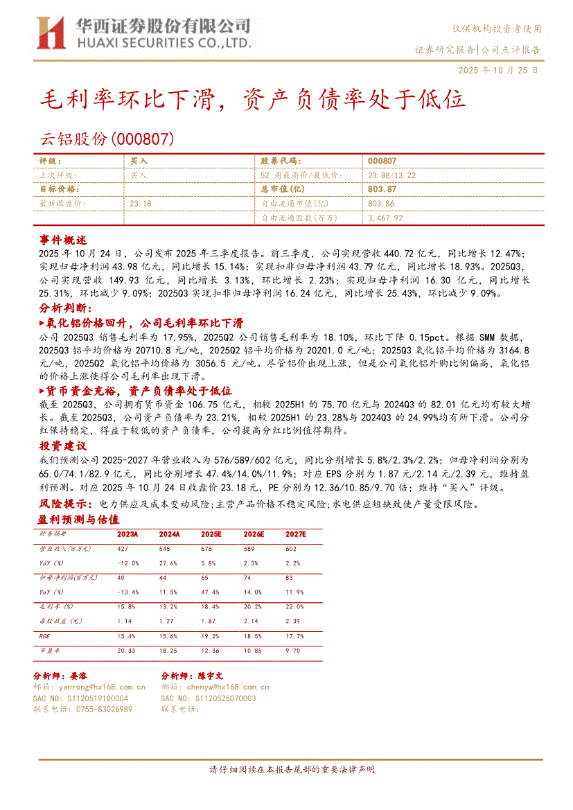 云铝股份:华西证券-云铝股份-000807-毛利率环比下滑,资产负债率处于低位-251025