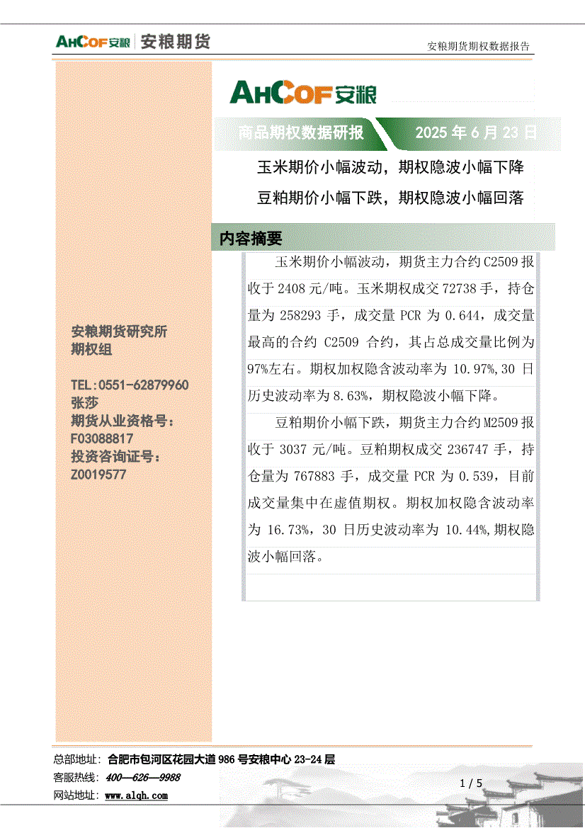 安粮期货-商品期权数据研报:玉米期价小幅波动,期权隐波小幅下降;豆粕期价小幅下跌,期权隐波小幅回落-250623