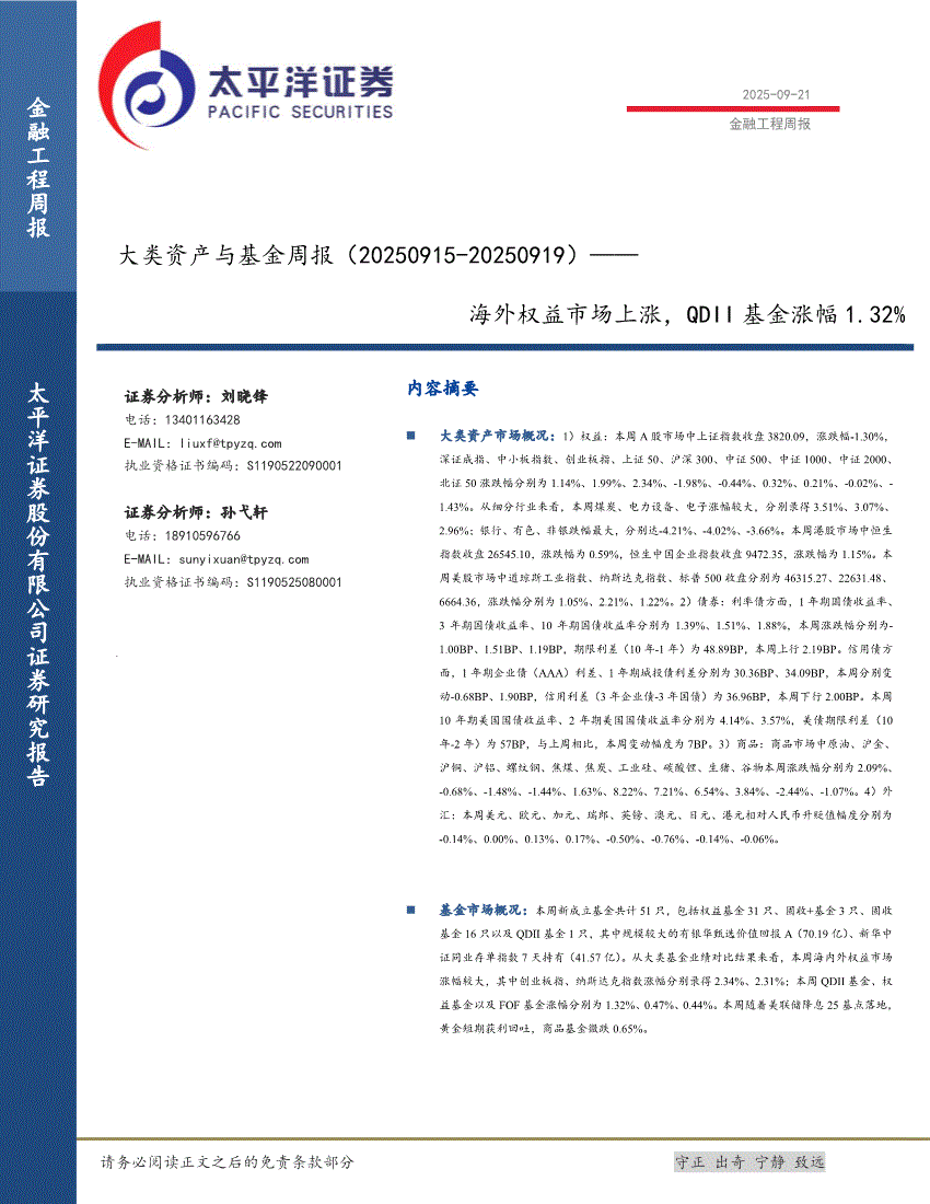 太平洋证券-大类资产与基金周报:海外权益市场上涨,QDII基金涨幅1.32%-250921