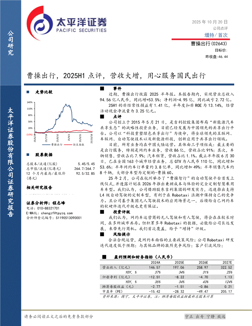 曹操出行:太平洋证券-曹操出行-2643.HK-2025H1点评,营收大增,用心服务国民出行-251020