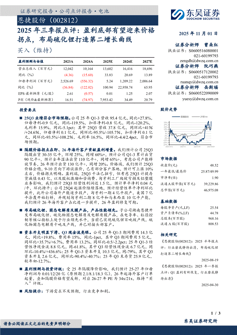 恩捷股份:东吴证券-恩捷股份-002812-2025年三季报点评:盈利底部有望迎来价格拐点,布局硫化锂打造第二增长曲线-251101