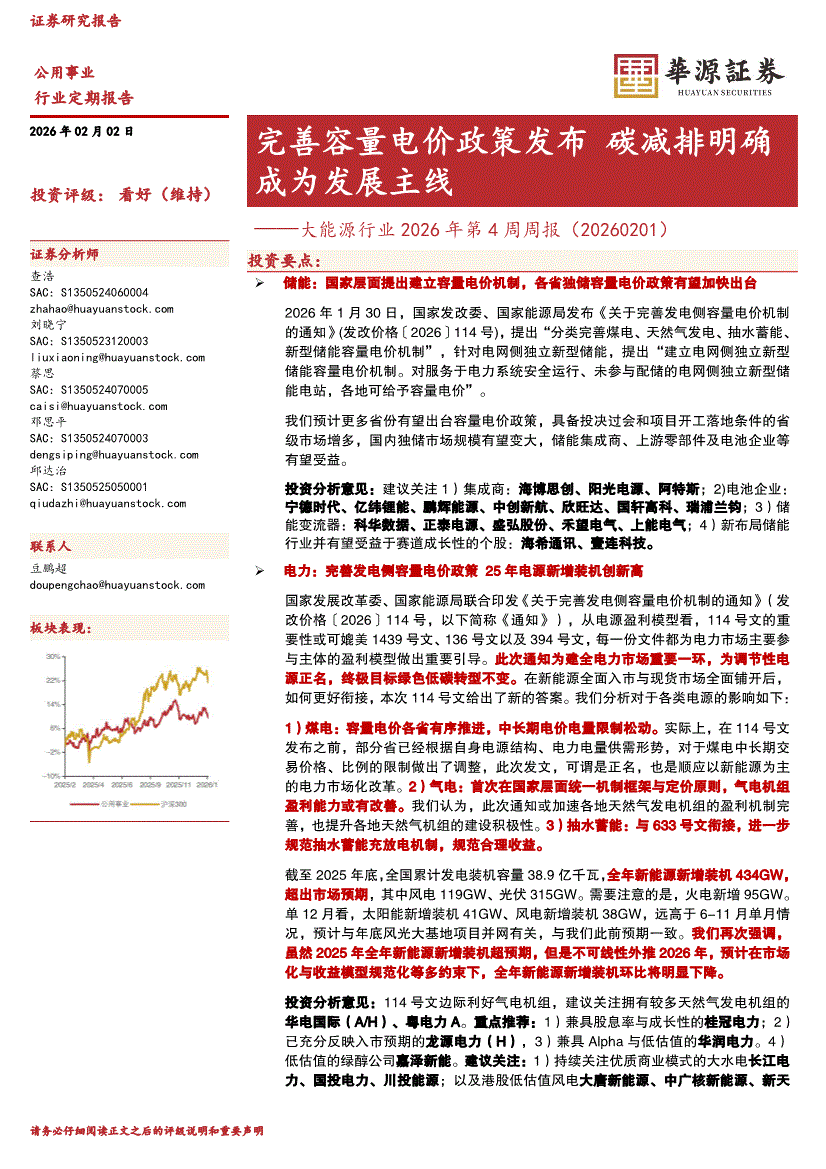 大能源行业:华源证券-大能源行业2026年第4周周报:完善容量电价政策发布,碳减排明确成为发展主线-260202