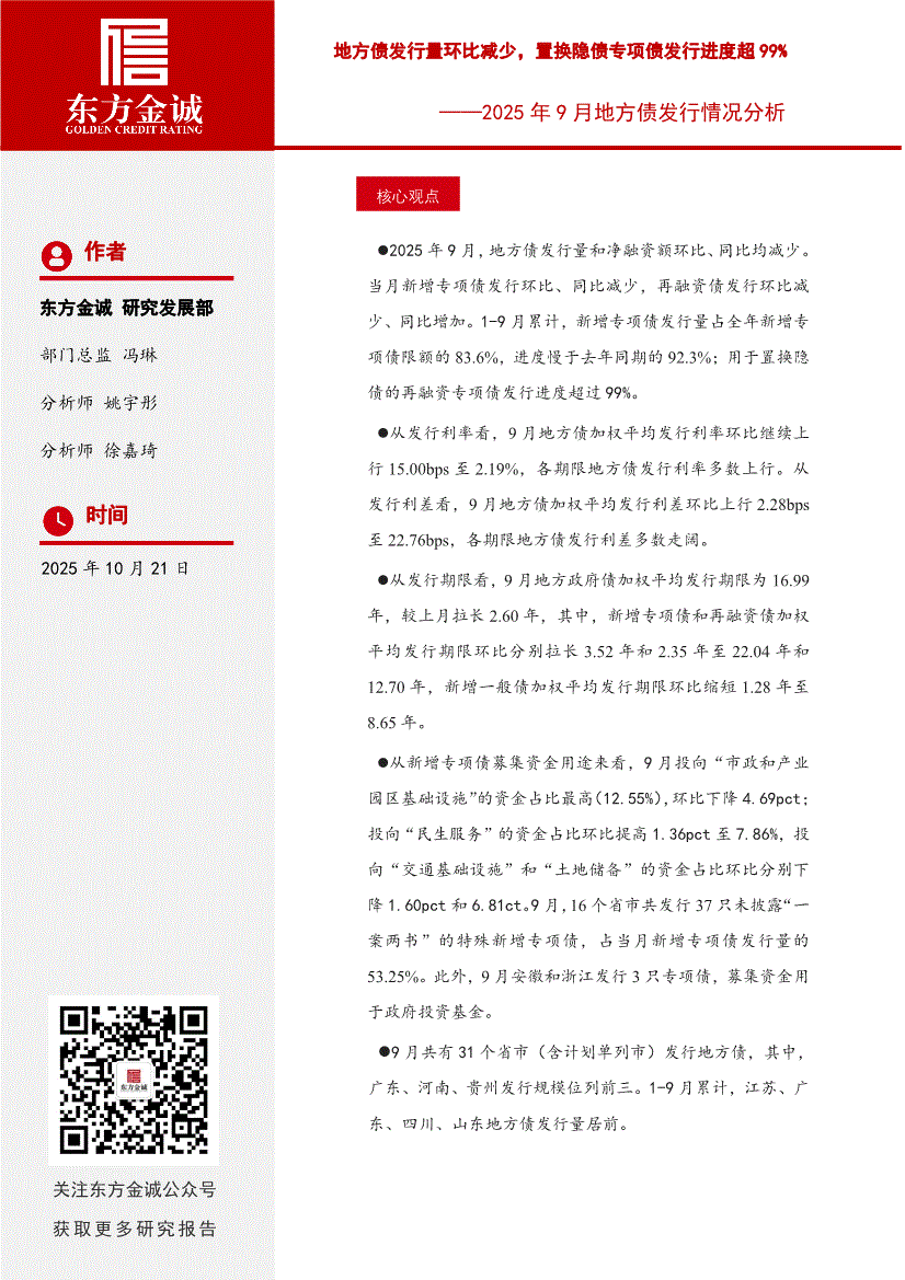 东方金诚-2025年9月地方债发行情况分析:地方债发行量环比减少,置换隐债专项债发行进度超99%-251021