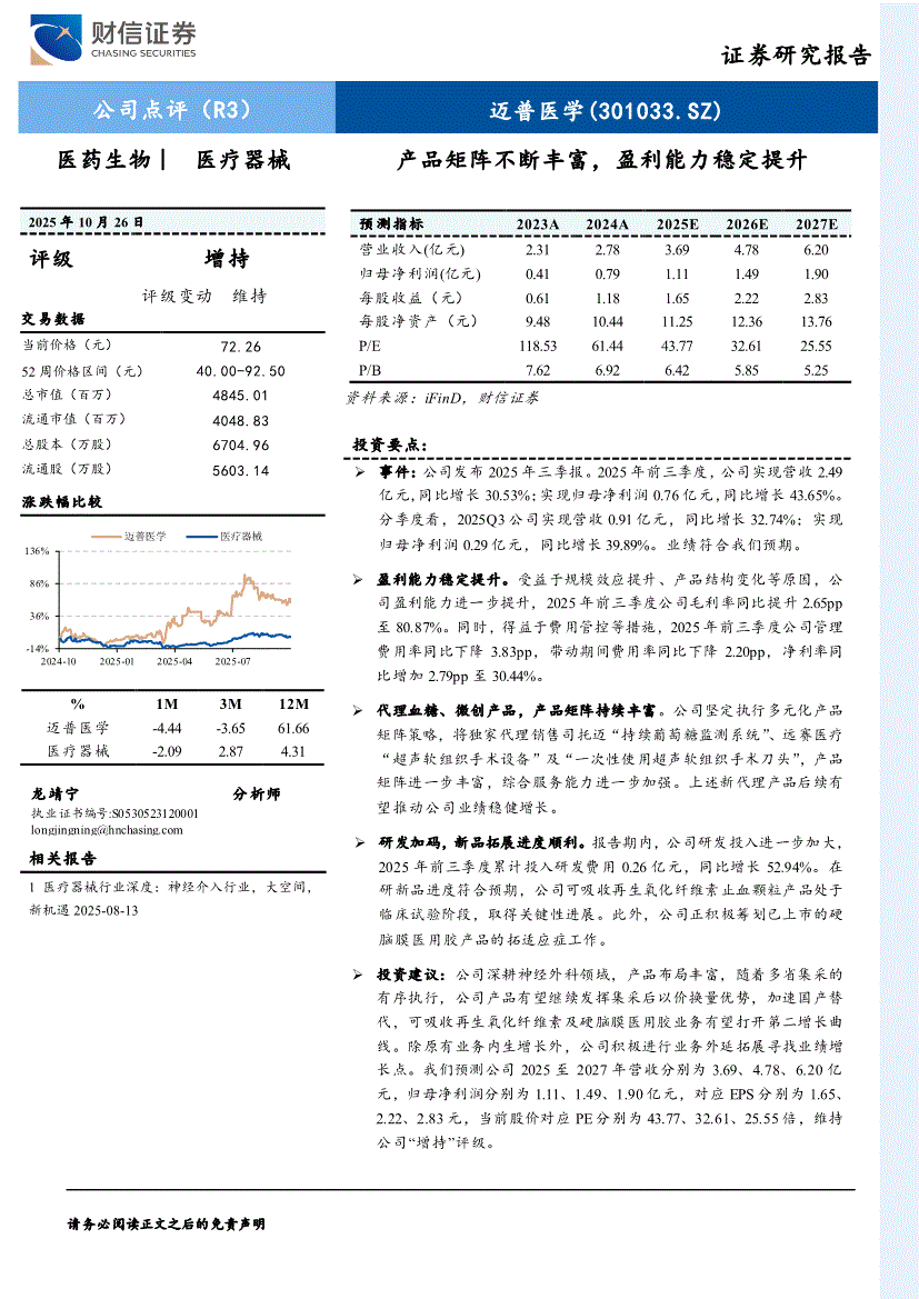迈普医学:财信证券-迈普医学-301033-产品矩阵不断丰富,盈利能力稳定提升-251026