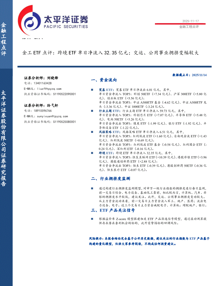 太平洋证券-金工ETF点评:跨境ETF单日净流入32.35亿元;交运、公用事业拥挤变幅较大-251117