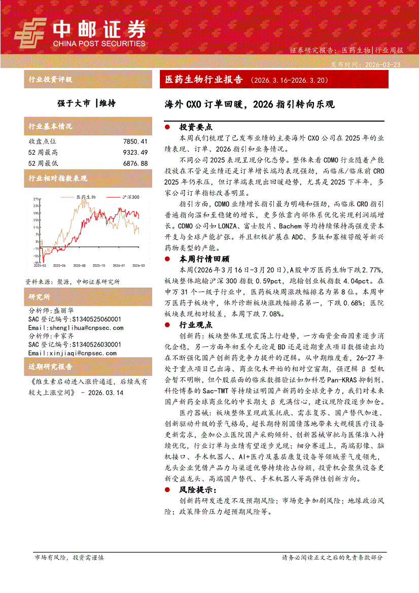 医药生物行业:中邮证券-医药生物行业周报:海外CXO订单回暖,2026指引转向乐观-260323