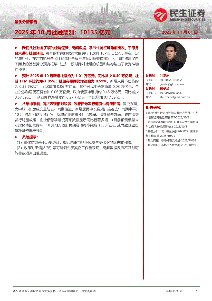 民生证券-量化分析报告:2025年10月社融预测,10135亿元-251101