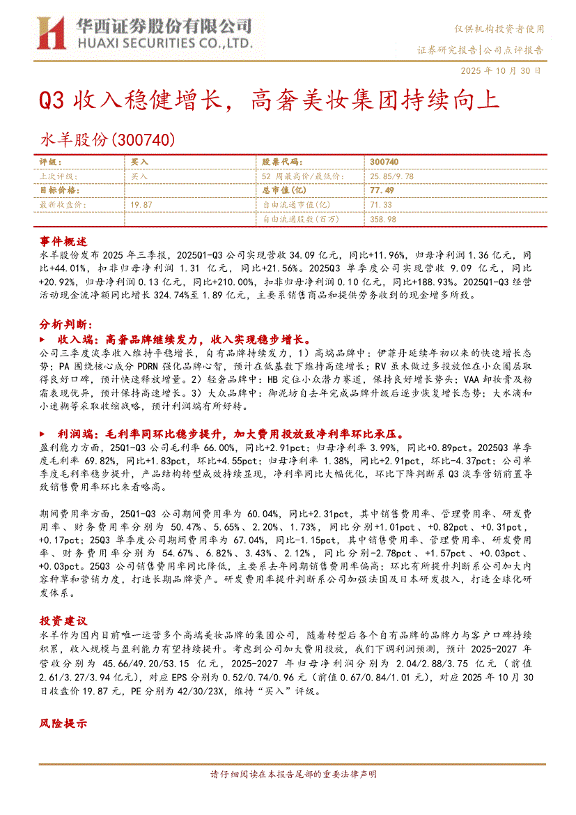 水羊股份:华西证券-水羊股份-300740-Q3收入稳健增长,高奢美妆集团持续向上-251030