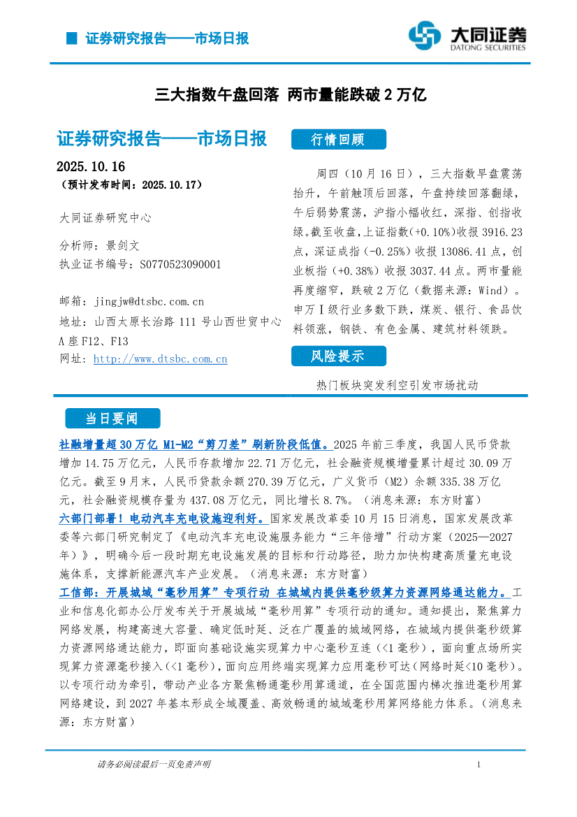 大同证券-市场日报:三大指数午盘回落,两市量能跌破2万亿-251016