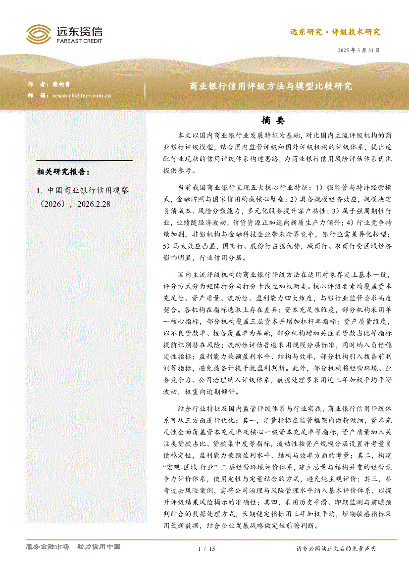 远东资信-商业银行信用评级方法与模型比较研究-260331