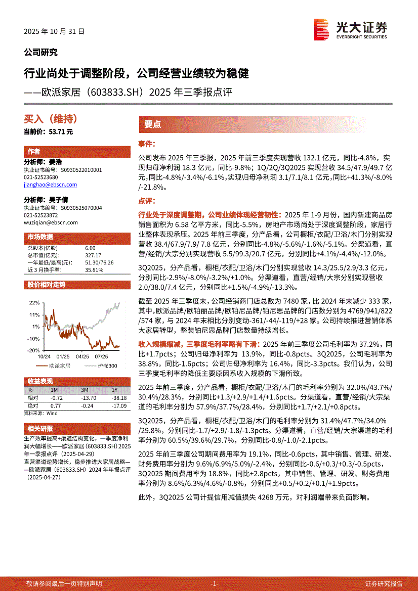 欧派家居:光大证券-欧派家居-603833-2025年三季报点评:行业尚处于调整阶段,公司经营业绩较为稳健-251031