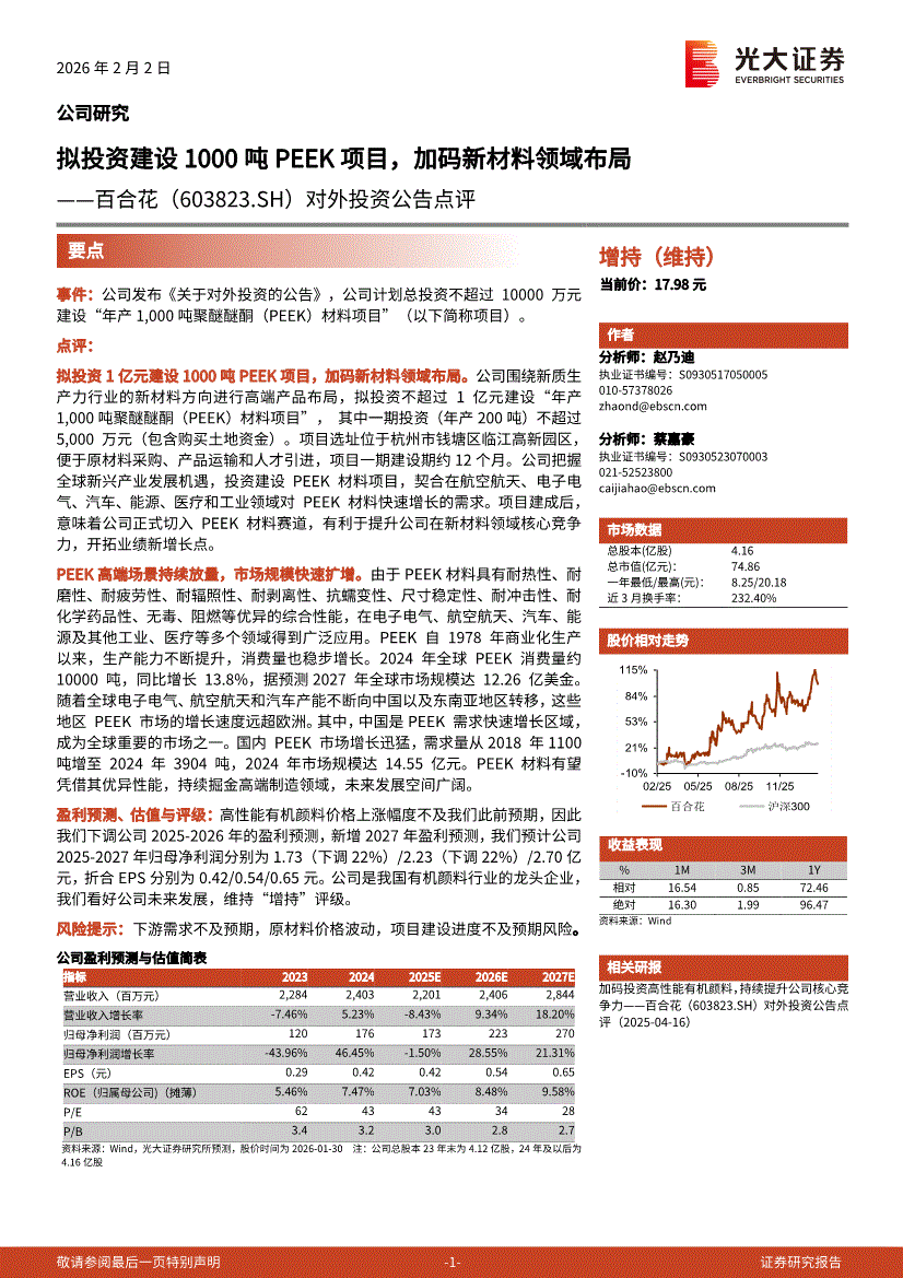 百合花:光大证券-百合花-603823-对外投资公告点评:拟投资建设1000吨PEEK项目,加码新材料领域布局-260202