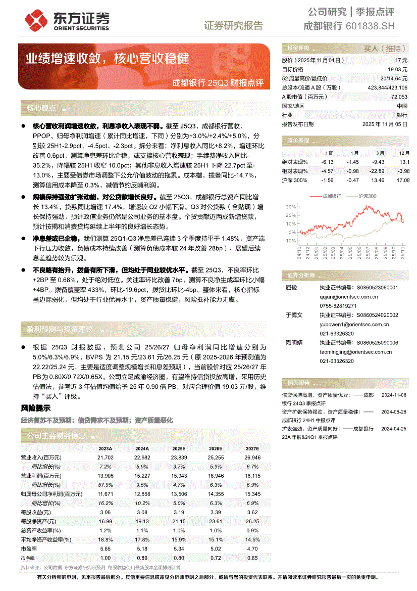 成都银行:东方证券-成都银行-601838-25Q3财报点评:业绩增速收敛,核心营收稳健-251105