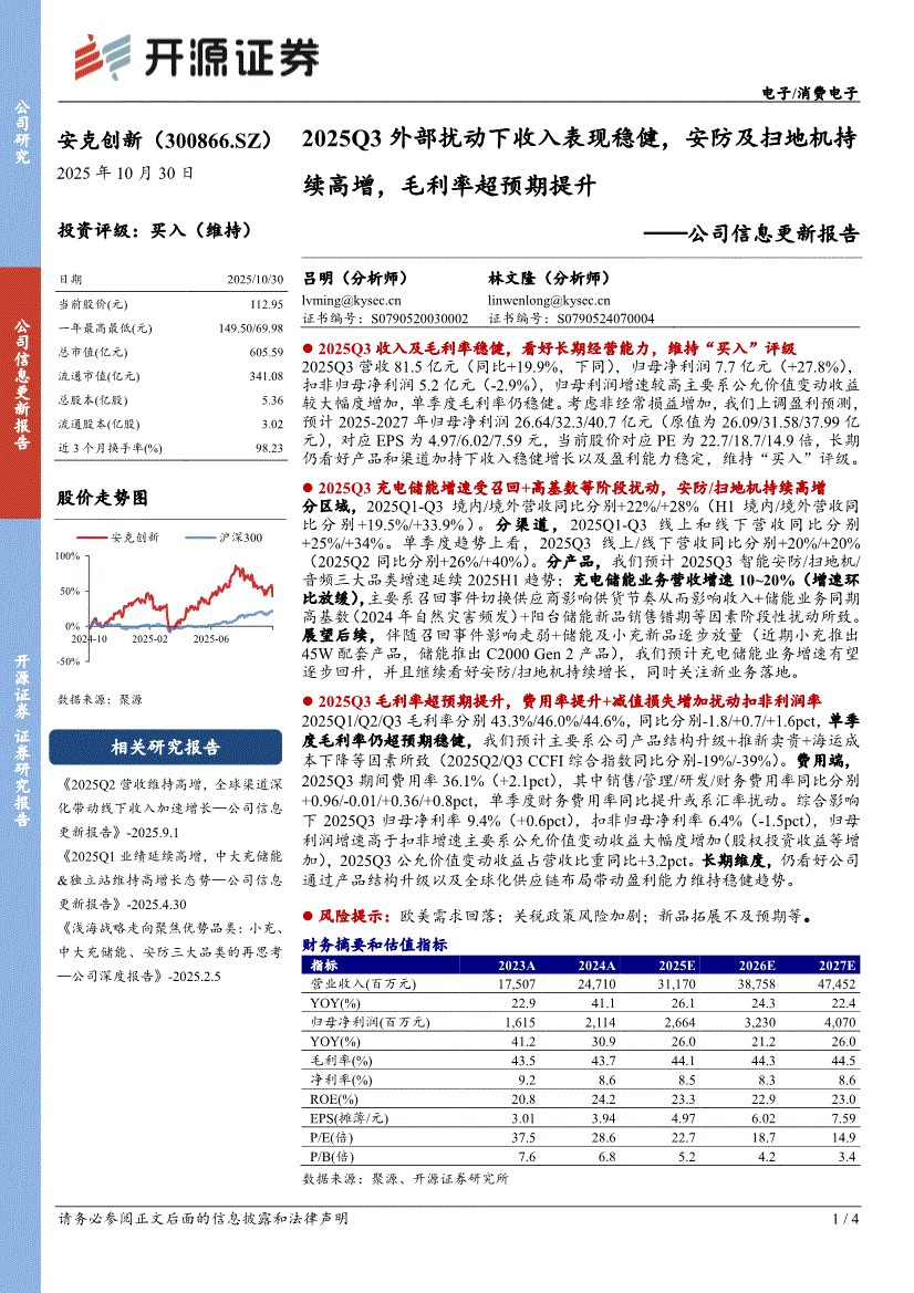 安克创新:开源证券-安克创新-300866-公司信息更新报告:2025Q3外部扰动下收入表现稳健,安防及扫地机持续高增,毛利率超预期提升-251030