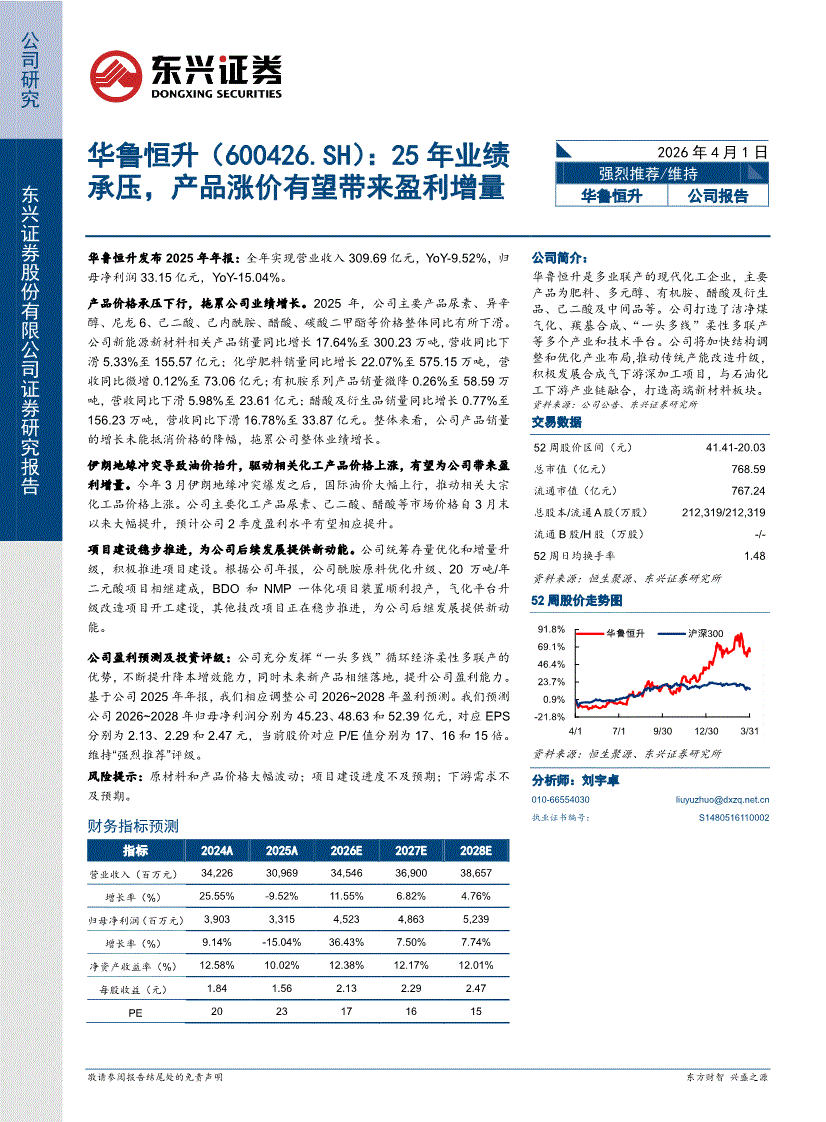 华鲁恒升:东兴证券-华鲁恒升-600426-25年业绩承压,产品涨价有望带来盈利增量-260401