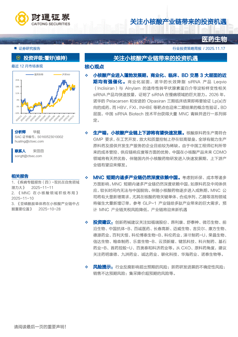 医药生物行业:财通证券-医药生物行业投资策略周报:关注小核酸产业链带来的投资机遇-251117