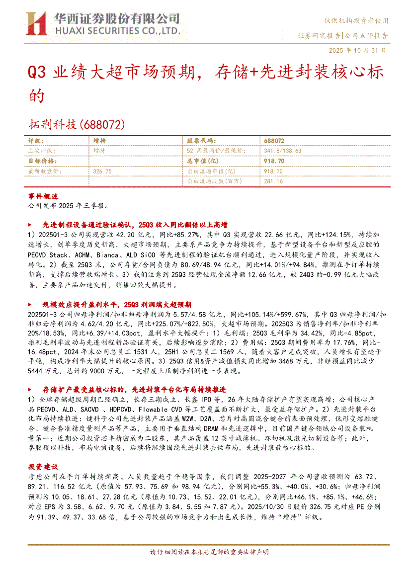 拓荆科技:华西证券-拓荆科技-688072-Q3业绩大超市场预期,存储+先进封装核心标的-251031