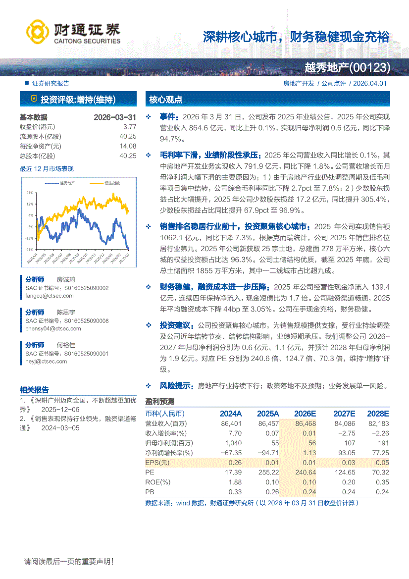 越秀地产:财通证券-越秀地产-0123.HK-深耕核心城市,财务稳健现金充裕-260401
