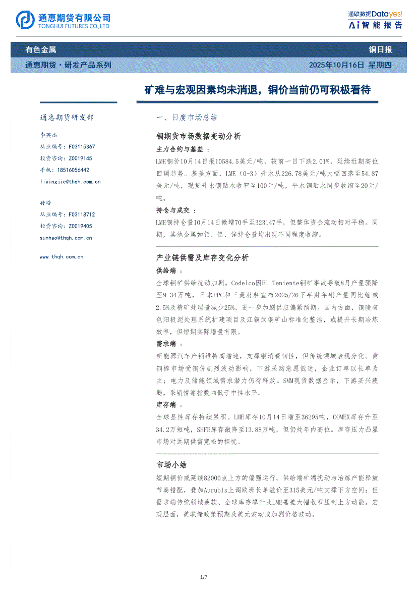 通惠期货-铜日报:矿难与宏观因素均未消退,铜价当前仍可积极看待-251016