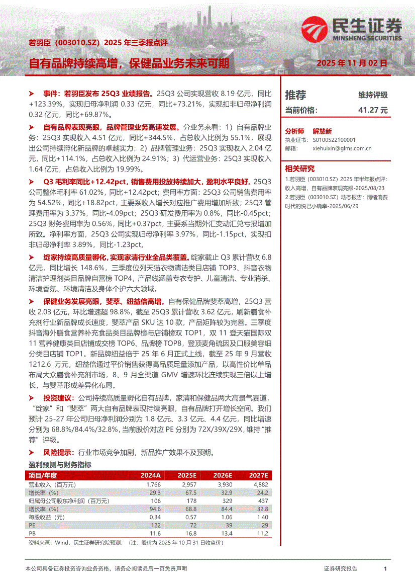 若羽臣:民生证券-若羽臣-003010-2025年三季报点评:自有品牌持续高增,保健品业务未来可期-251102