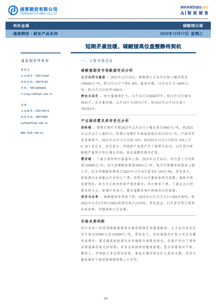 通惠期货-碳酸锂日报:短期矛盾放缓,碳酸锂高位盘整静待契机-251217