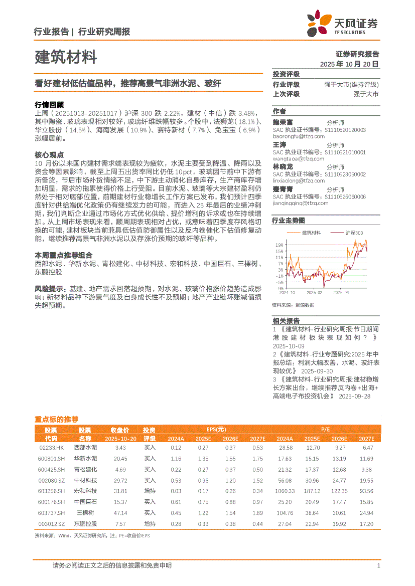 建筑材料行业:天风证券-建筑材料行业研究周报:看好建材低估值品种,推荐高景气非洲水泥、玻纤-251020