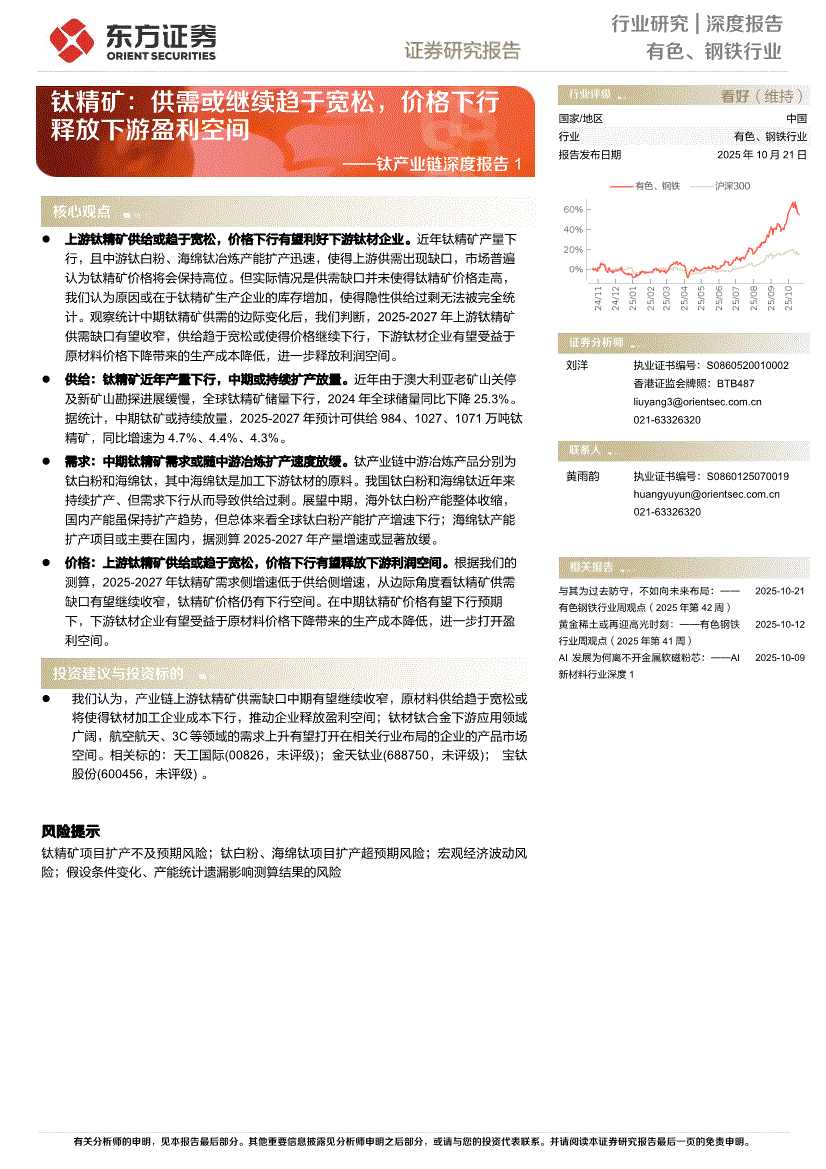 有色、钢铁行业:东方证券-有色、钢铁行业钛产业链深度报告1:钛精矿,供需或继续趋于宽松,价格下行释放下游盈利空间-251021