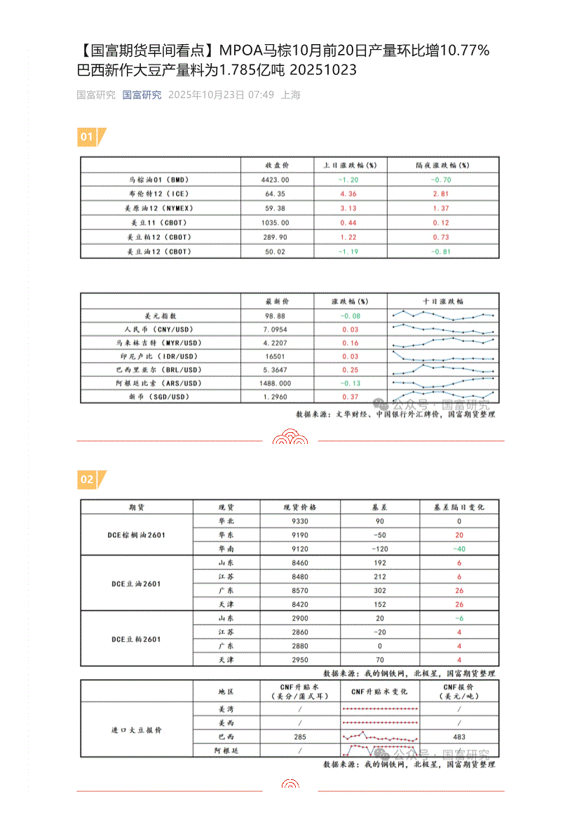 国富期货-【早间看点】MPOA马棕10月前20日产量环比增10.77%,巴西新作大豆产量料为1.785亿吨-251023