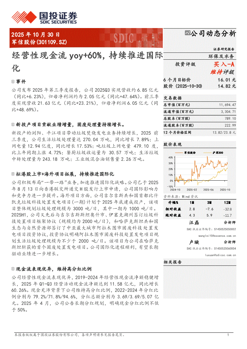 军信股份:国投证券-军信股份-301109-经营性现金流yoy+60%,持续推进国际化-251030