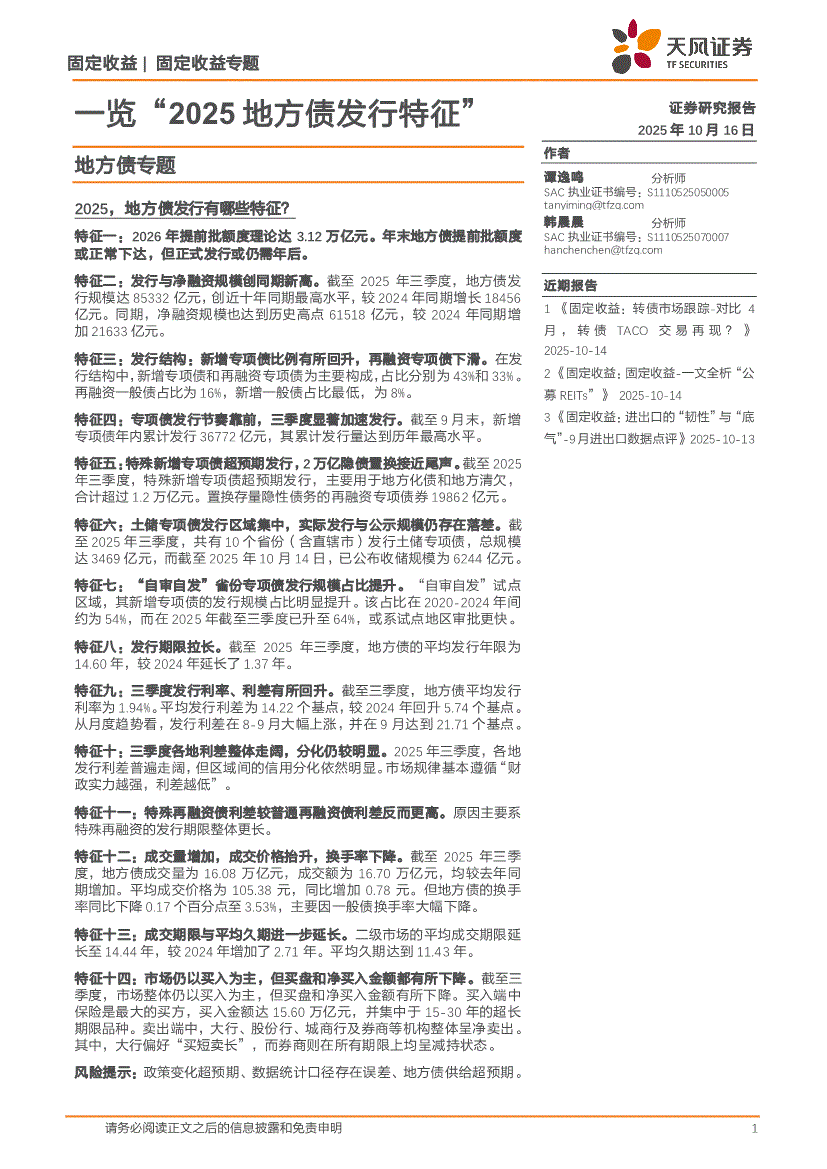 天风证券-地方债专题:一览“2025地方债发行特征”-251016