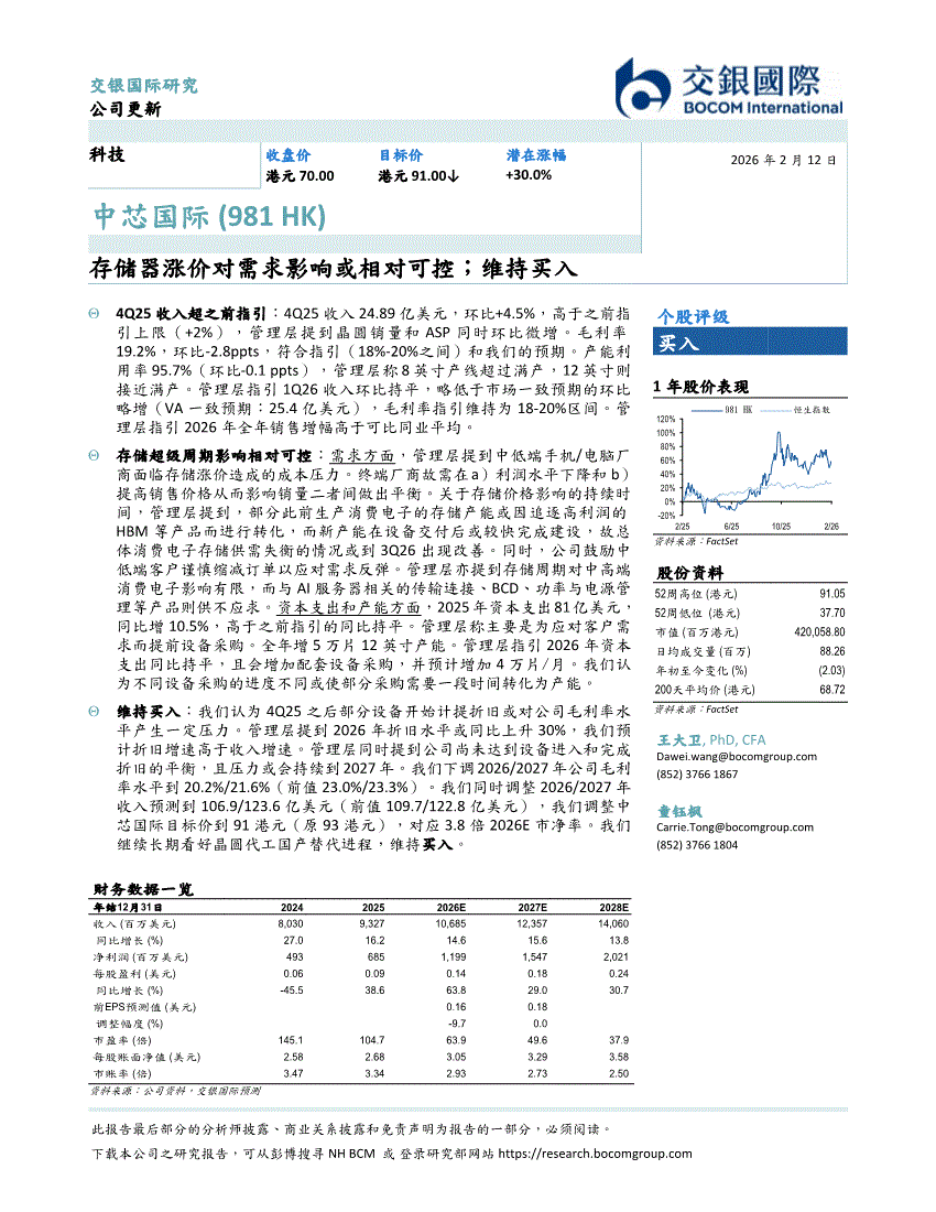 中芯国际:交银国际-中芯国际-0981.HK-存储器涨价对需求影响或相对可控;维持买入-260212