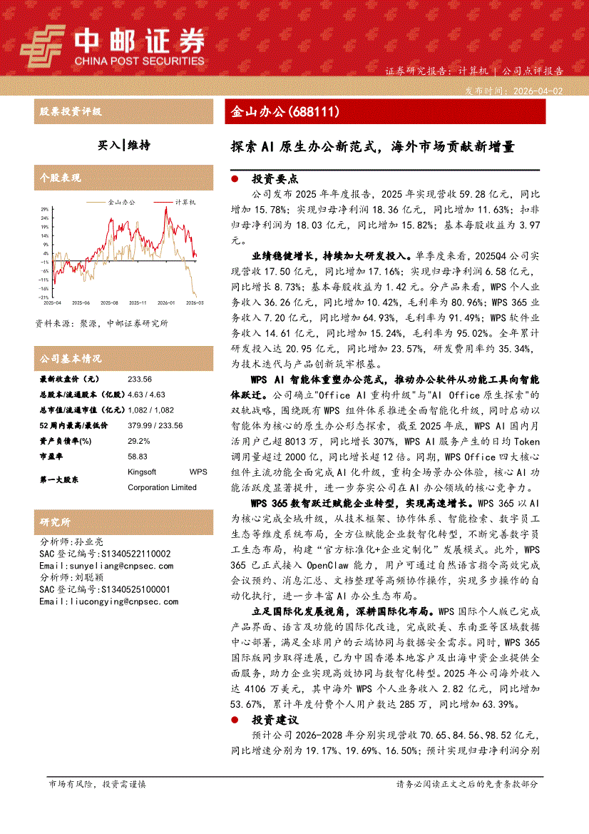 金山办公:中邮证券-金山办公-688111-探索AI原生办公新范式,海外市场贡献新增量-260402