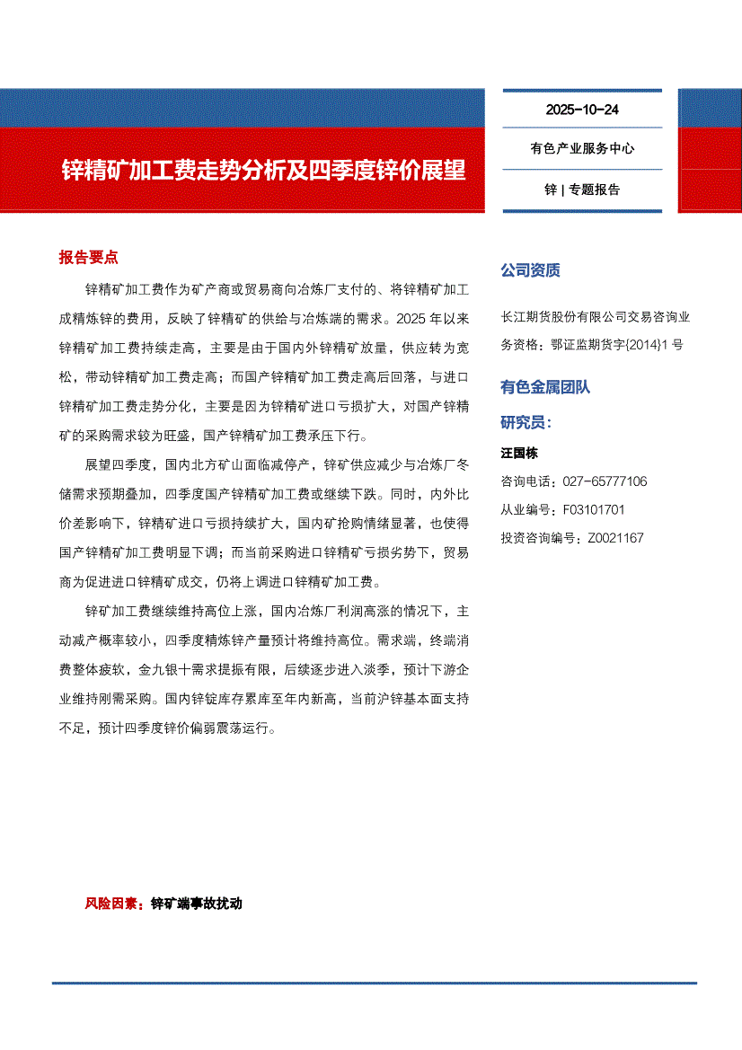 长江期货-锌|专题报告:锌精矿加工费走势分析及四季度锌价展望-251024