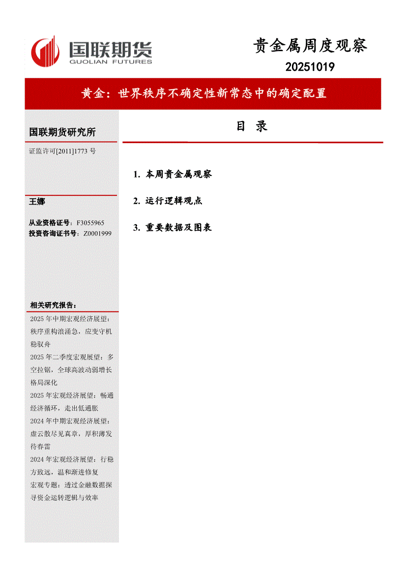 国联期货-贵金属周度观察:黄金,世界秩序不确定性新常态中的确定配置-251019