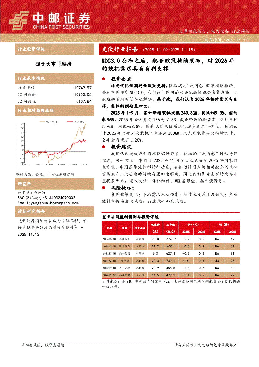 光伏行业:中邮证券-光伏行业报告:NDC3.0公布之后,配套政策持续发布,对2026年的装机需求具有有利支撑-251117