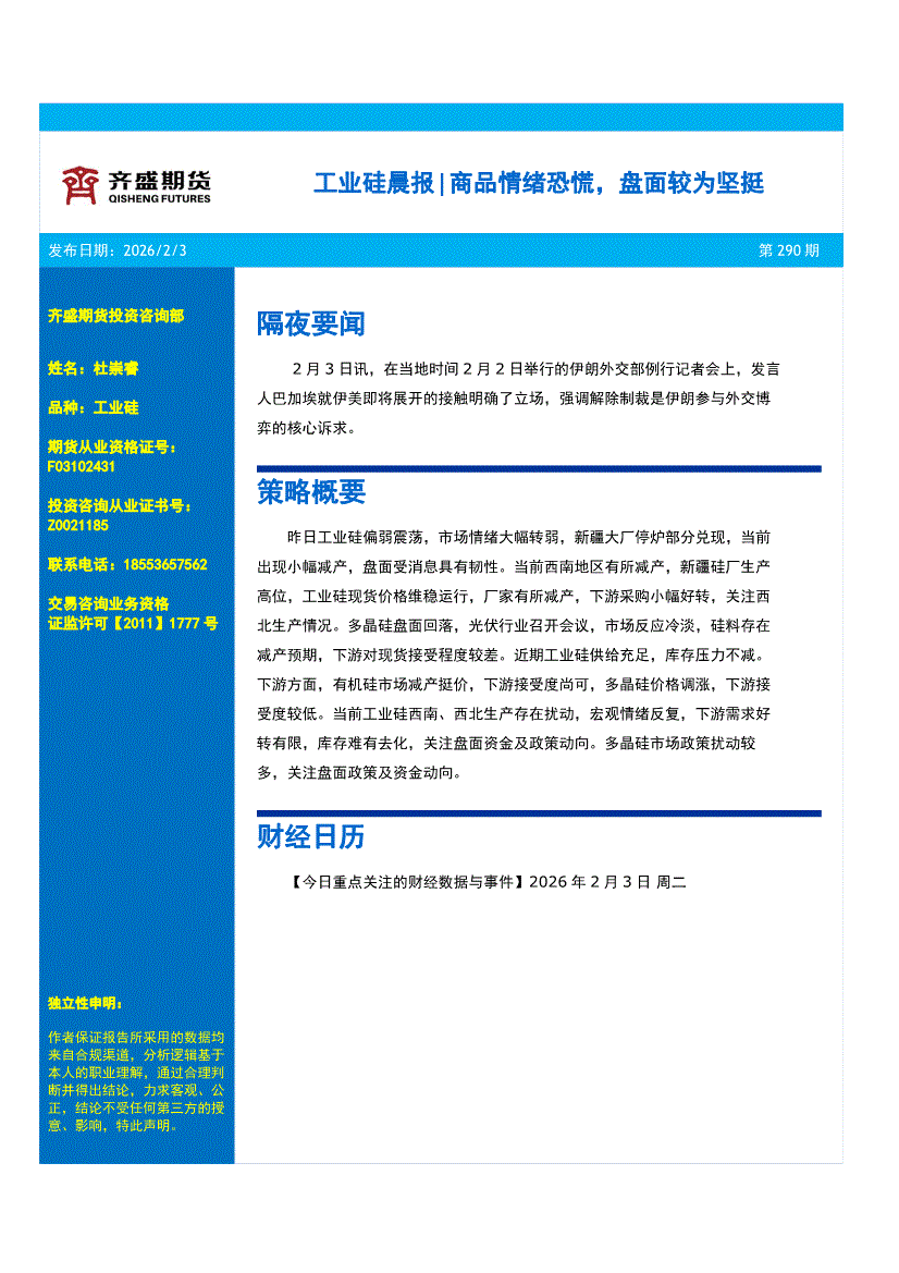 齐盛期货-工业硅晨报:商品情绪恐慌,盘面较为坚挺-260203
