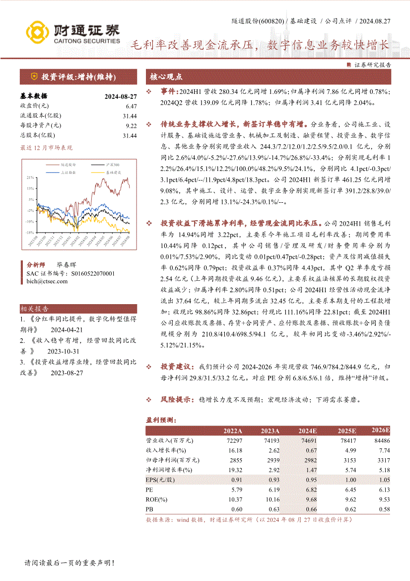 隧道股份:财通证券-隧道股份-600820-毛利率改善现金流承压,数字信息业务较快增长-240827