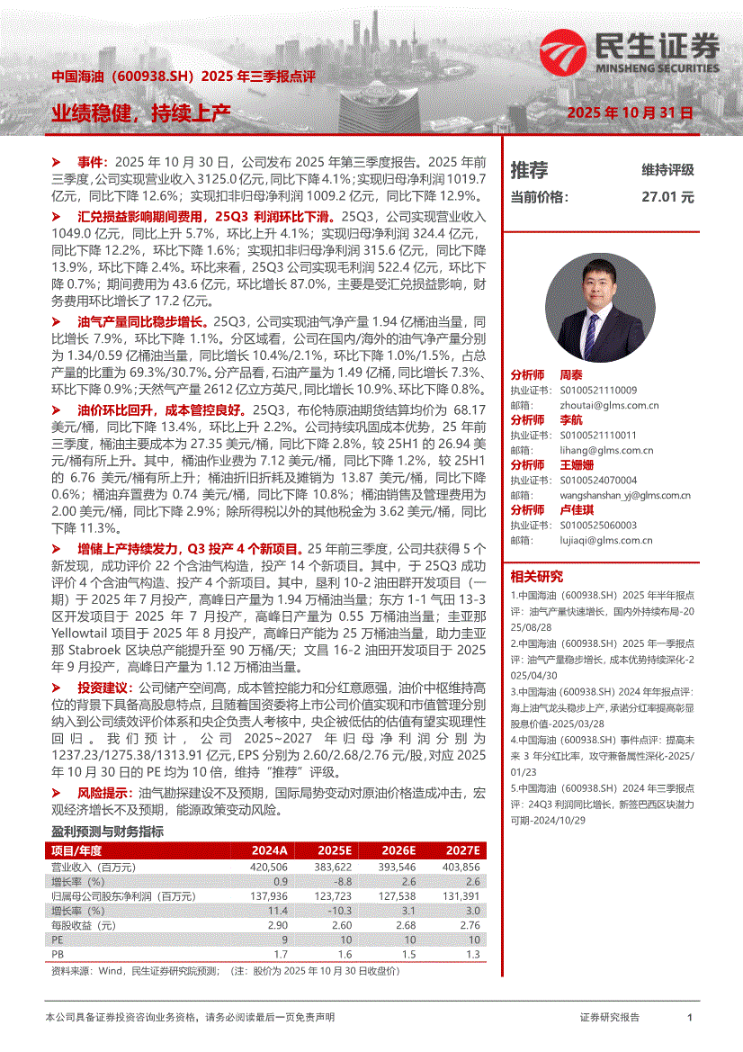 中国海油:民生证券-中国海油-600938-2025年三季报点评:业绩稳健,持续上产-251031