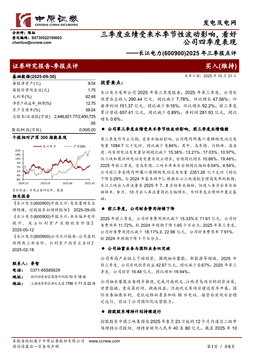 长江电力:中原证券-长江电力-600900-2025年三季报点评:三季度业绩受来水季节性波动影响,看好公司四季度表现-251031
