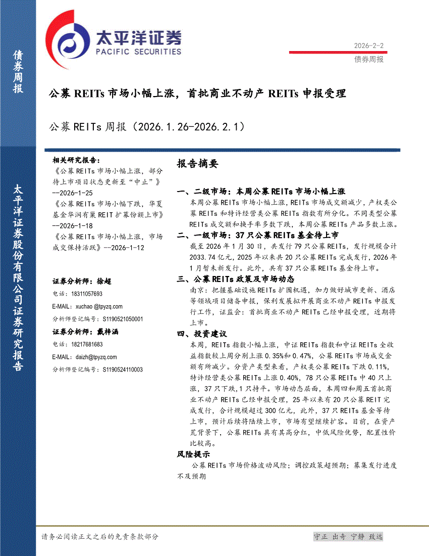 太平洋证券-公募REITs周报:公募REITs市场小幅上涨,首批商业不动产REITs申报受理-260202