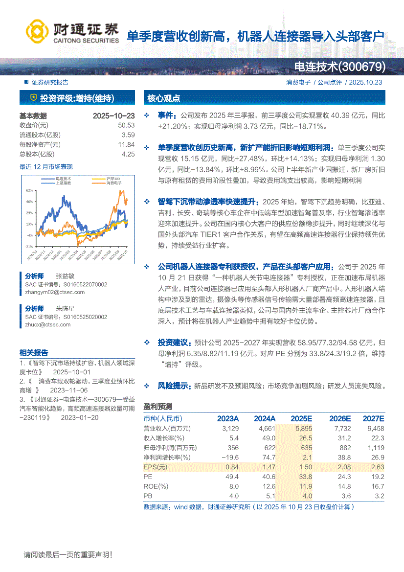 电连技术:财通证券-电连技术-300679-单季度营收创新高,机器人连接器导入头部客户-251023