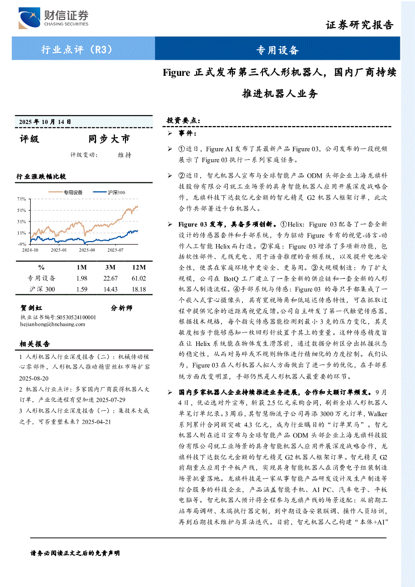 专用设备行业:财信证券-专用设备行业:Figure正式发布第三代人形机器人,国内厂商持续推进机器人业务-251014