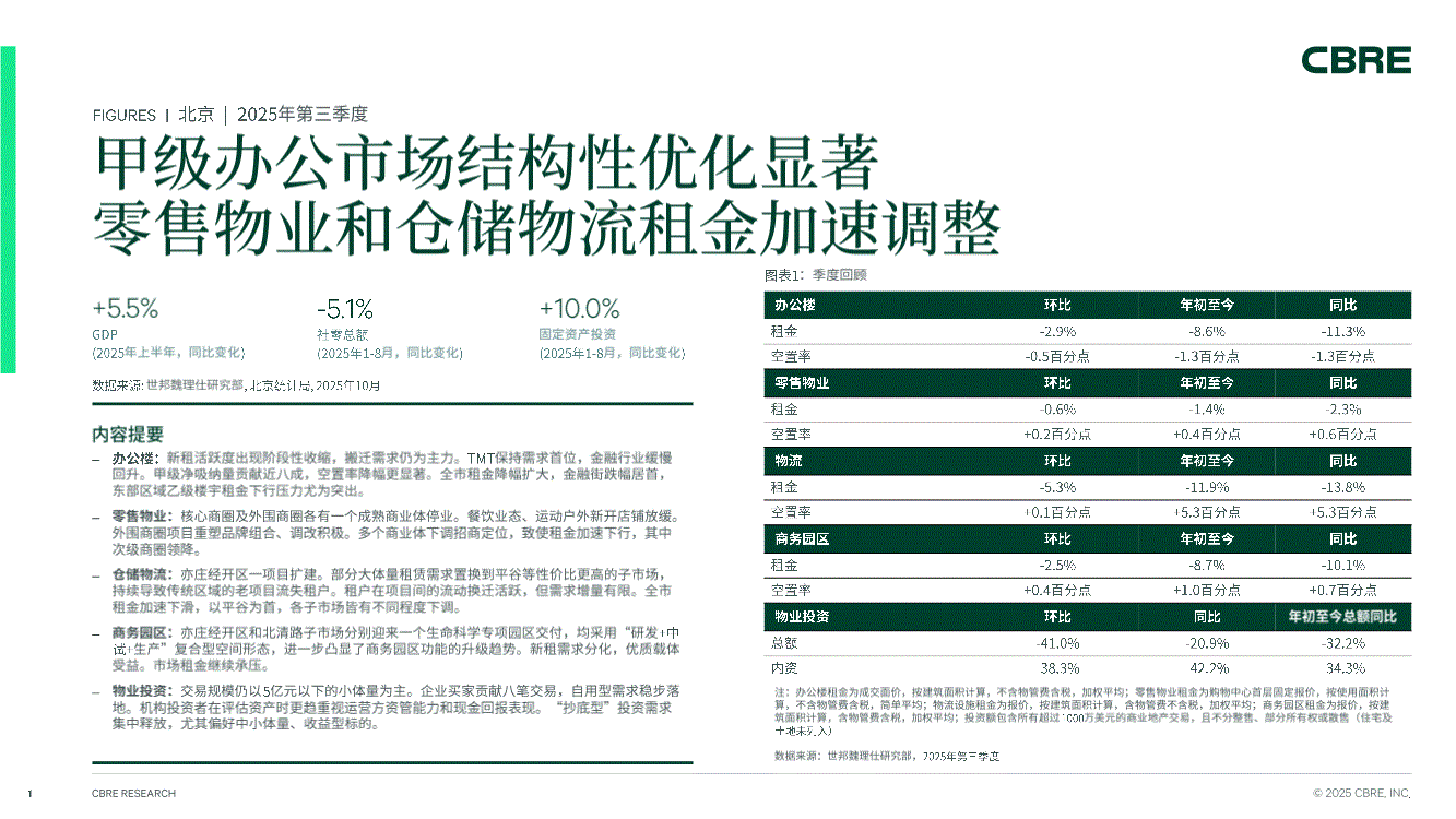 房地产行业:CBRE-房地产行业北京2025年第三季度:甲级办公市场结构性优化显著,零售物业和仓储物流租金加速调整-251101