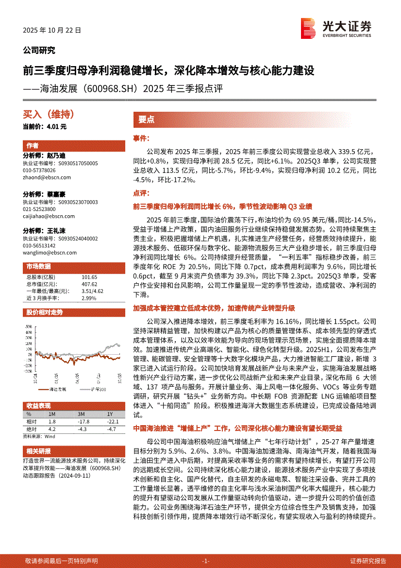 海油发展:光大证券-海油发展-600968-2025年三季报点评:前三季度归母净利润稳健增长,深化降本增效与核心能力建设-251022